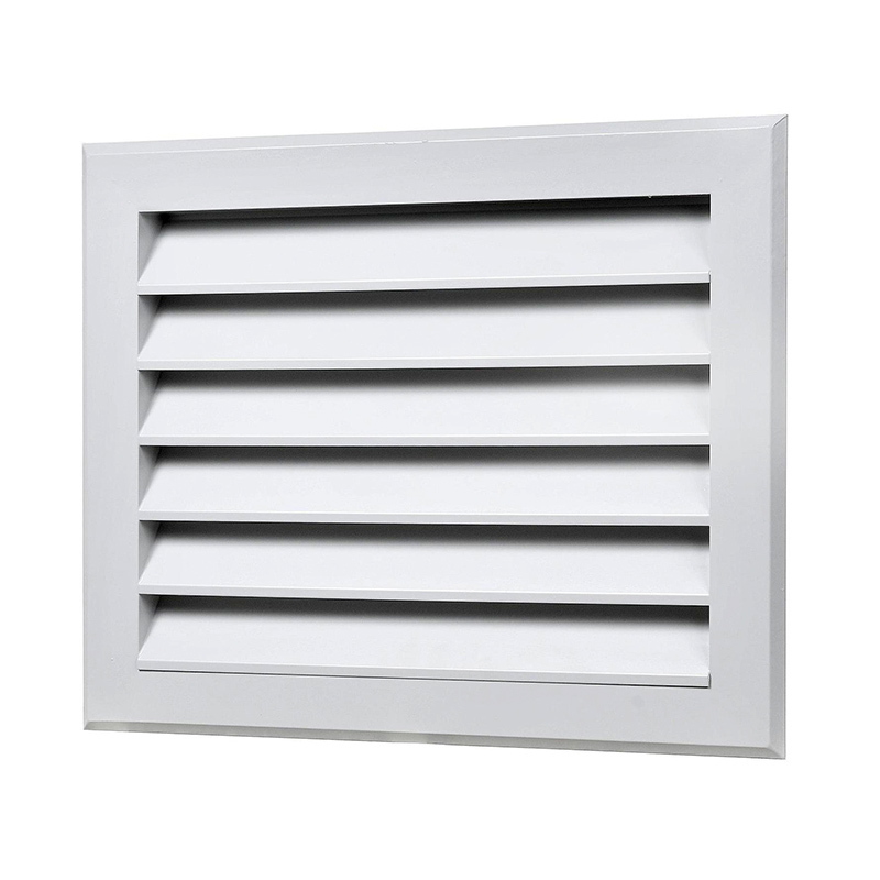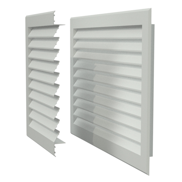 Решетки EAL- алюминиевые решетки для наружной установки, покрашены методом порошкового напыления в белый цвет (RAL 9016). Живое сечение составляет 41% от площади решетки. Жалюзи расположены под углом 45 градусов, что исключает попадание воды или снега через решетку.